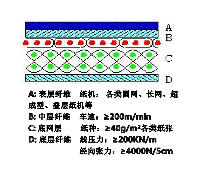 疊層 BOM 包括 1+1、1+2、1+1+1 等組織結(jié)構(gòu)的底網(wǎng)造紙毛毯,具有耐高線壓、彈性好、濾水性好、容水空間大、尺寸穩(wěn)定、能消除各類毯痕、使用壽命長等特點。適用于具有復合壓榨、大輥徑壓榨、靴式壓榨等壓榨形式的中高速紙機,生產(chǎn)高、中檔文化用紙、板紙等各類紙張。