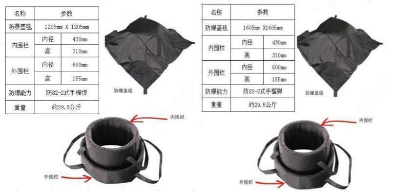 睿盾防爆毯采用雙圍欄結(jié)構(gòu),能阻擋82-2式手榴彈爆炸時所產(chǎn)生的破壞效應(yīng),相當(dāng)于70g TNT高爆炸藥的爆炸威力,對爆炸碎片和沖擊效應(yīng)可以形成三層阻擋作用,從而保護(hù)爆炸中心附近的人和物免受損傷,是現(xiàn)場臨時處置爆炸物品的重要裝置。